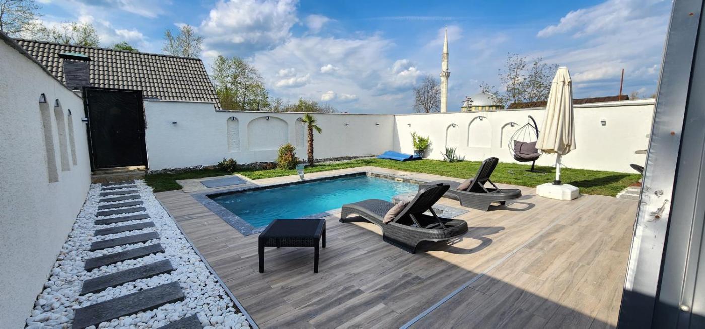 Two-Bedroom House. This holiday home boasts a private pool and a sauna. This air-conditioned holiday home is comprised of 1 living room, 2 separate bedrooms and 1 bathroom with a shower. The holiday homes kitchenette, which features a refrigerator, is available for cooking and storing food. The holiday home offers a tea and coffee maker, a dining area, a barbecue, a flat-screen TV, as well as garden views. The unit offers 4 beds.