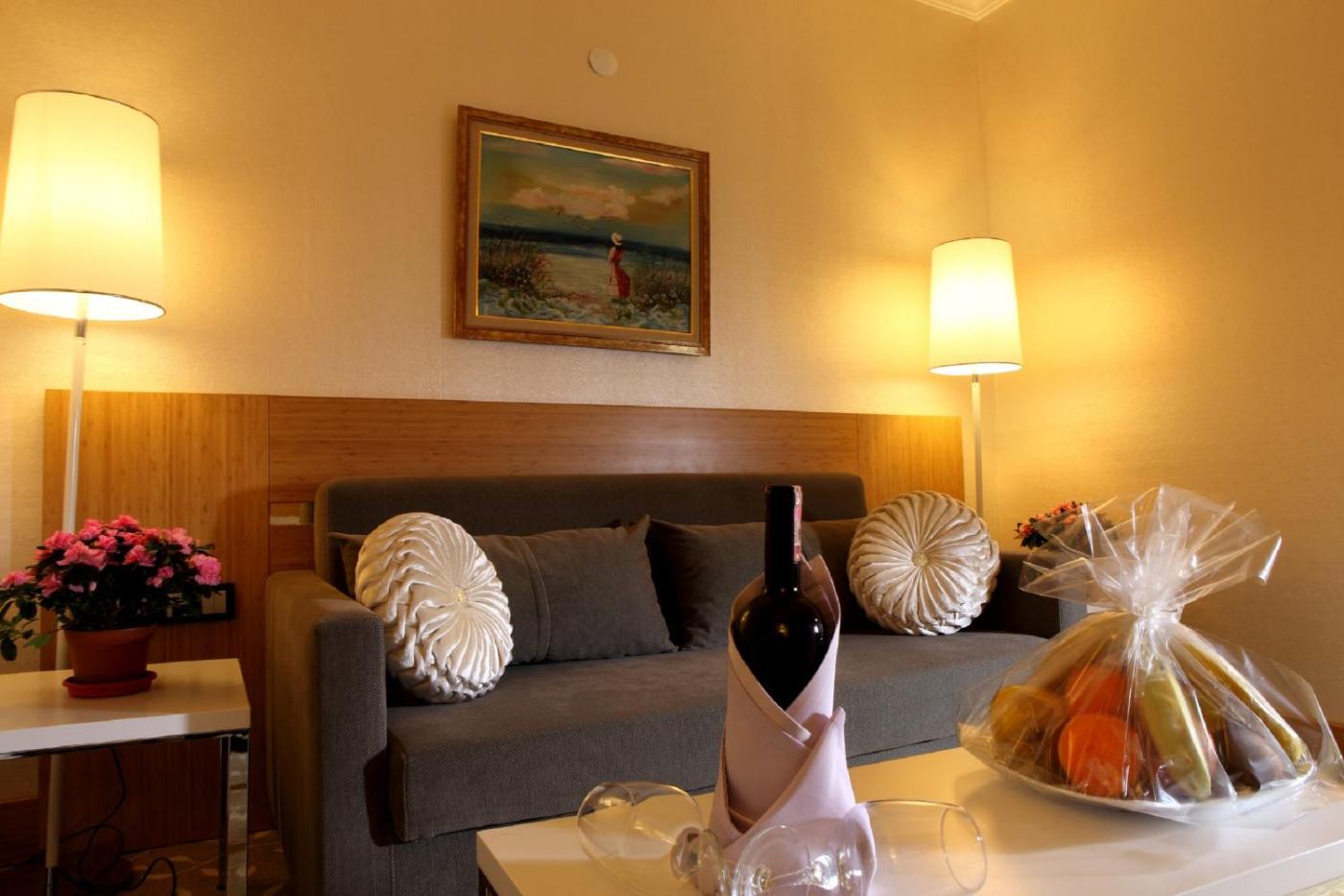 Deluxe Suite. This suite consists of 1 living room, 1 separate bedroom and 1 bathroom with a bath and free toiletries. The air-conditioned suite provides a flat-screen TV with satellite channels, soundproof walls, a minibar, executive lounge access as well as city views. The unit offers 2 beds. ;